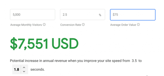 Test My Site kan också hjälpa dig att räkna på hur mycket din insats kommer ge dig. Ange webbplatsens antal genomsnittliga månatliga besökare, en genomsnittlig konverteringsfrekvens och ett genomsnittligt ordervärde. Verktyget uppskattar hur mycket mer intäkter ditt företag skulle generera med en snabbare webbplats. Även om det är sannolikt mycket grov, är uppskattningen verkligen intressant.